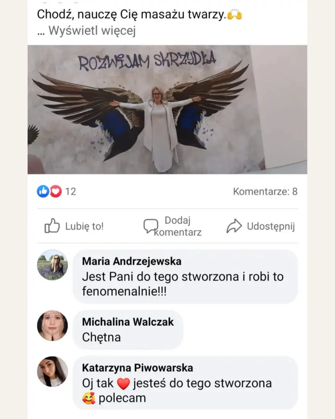 Dziś uczę tej metody i innych manualnych technik twarzy profesjonalistów, którzy chcą wynieść swoją praktykę na wyższy poziom. Na moich szkoleniach dostajesz nie tylko technikę, ale także praktyczne wskazówki, jak pracować bezpiecznie, skutecznie i z szacunkiem do klientki, jak łączyć różne narzędzia pracy i jak tworzyć ofertę, która wyróżni Twój gabinet na rynku.